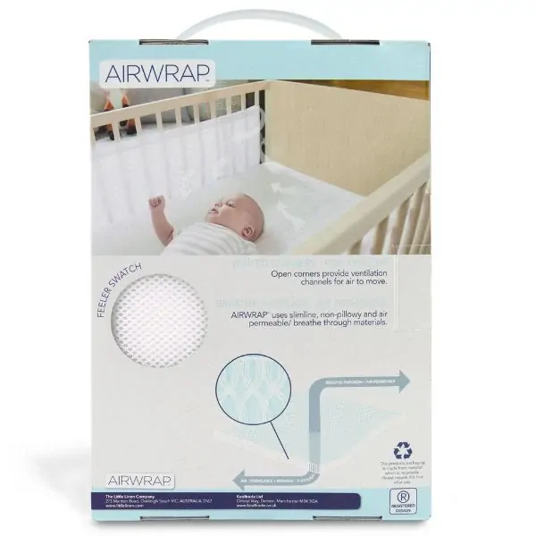 The AIRWRAP cot liner is an alternative to a cot bumper and is one of Australia's most trusted and popular nursery bedding items since 2006. Moderately padded to help parents protect their baby from knocks and from tangling in the cot framework. Air-permeable with vented corners for air to move.
