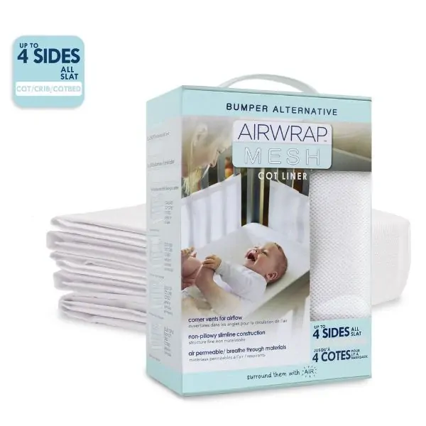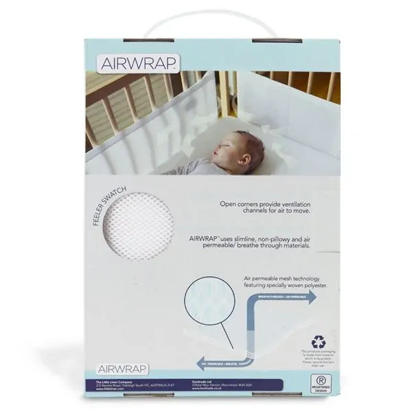 The AIRWRAP cot liner is an alternative to a cot bumper and is one of Australia's most trusted and popular nursery bedding items since 2006. Moderately padded to help parents protect their baby from knocks and from tangling in the cot framework. Air-permeable with vented corners for air to move.