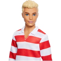• Ken doll wears a red and white striped, long-sleeve polo shirt paired with pink shorts for a colorful ensemble;