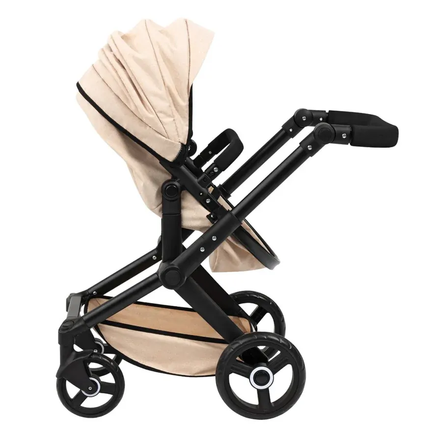 The combi doll’s pram XEO has a modern design and is suitable for dolls up to 52 cm. With its adjustable handle, this doll's pram is easily adaptable to your child's height; also, it's possible to mount the carrycot in direction of travel or towards your child. It’s also possible to change the angle of the carrycot, thus the doll's pram is convertible to a jogger pushchair with a few simple steps. The carrier’s cover will either way; if she's sitting or lying in the pram; protect the little doll from the sun and wind. The pivoted front wheels assure a stable cornering. For transportation reasons the doll's pram can easily be folded. The accompanying bag has a long handle to be used as a shoulder bag and two short ones as a hand bag.