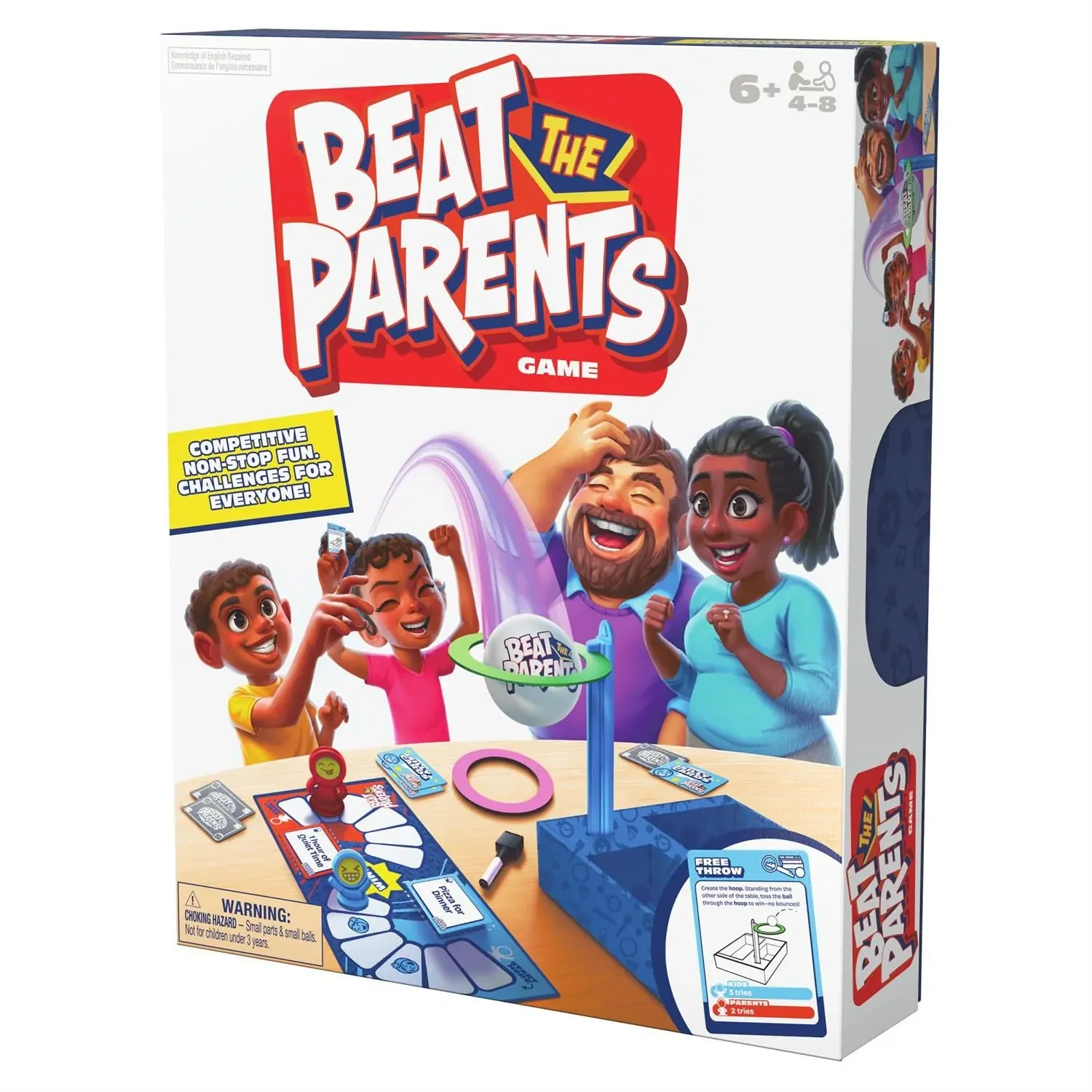 Who will rule the household? Team Kids face off against Team Parents in this fun family game where no one has advantage. Teams play challenges designed to test kids and parents equally, but this ain't your parents' Beat the Parents. New active twists and hundreds of hilarious viral challenges mean that family game nights will never be the same. Transform the box and punch-out pieces to build 3D obstacles for challenges while also answering trivia that tests all generations of players. This 2025 version of the classic Beat the Parents board game includes brand-new games and trivia challenges to keep everyone in the family on their toes.