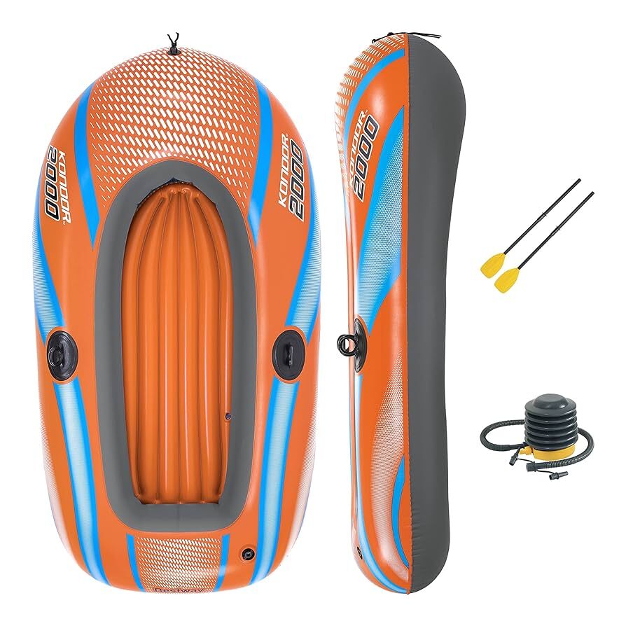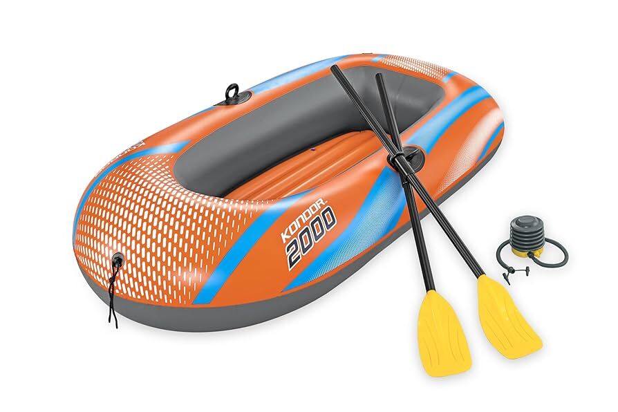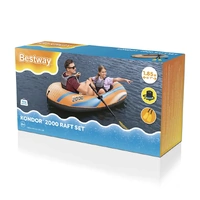 Bestway Kondor 2000 Raft set is a blast for families who want to explore the water together! Perfect for one child and one adult, it's easy to inflate so you can spend more time on fun and less time on setup. The raft features a comfortable, inflatable floor that's perfectly cushioned for added relaxation. It also comes with a rope attached to the front for extra safety, easy docking and convenient transport around the lake or pool. Oar clasps are built into the sides of the raft and will help keep oars, included in this set, in place when the raft is being used. From paddling to fishing to just floating along, this collection of rafts promises a summer to remember. Easy to use and easy to transport, the Kondor 2000 Raft Set is a no-brainer for your next day out on the water!