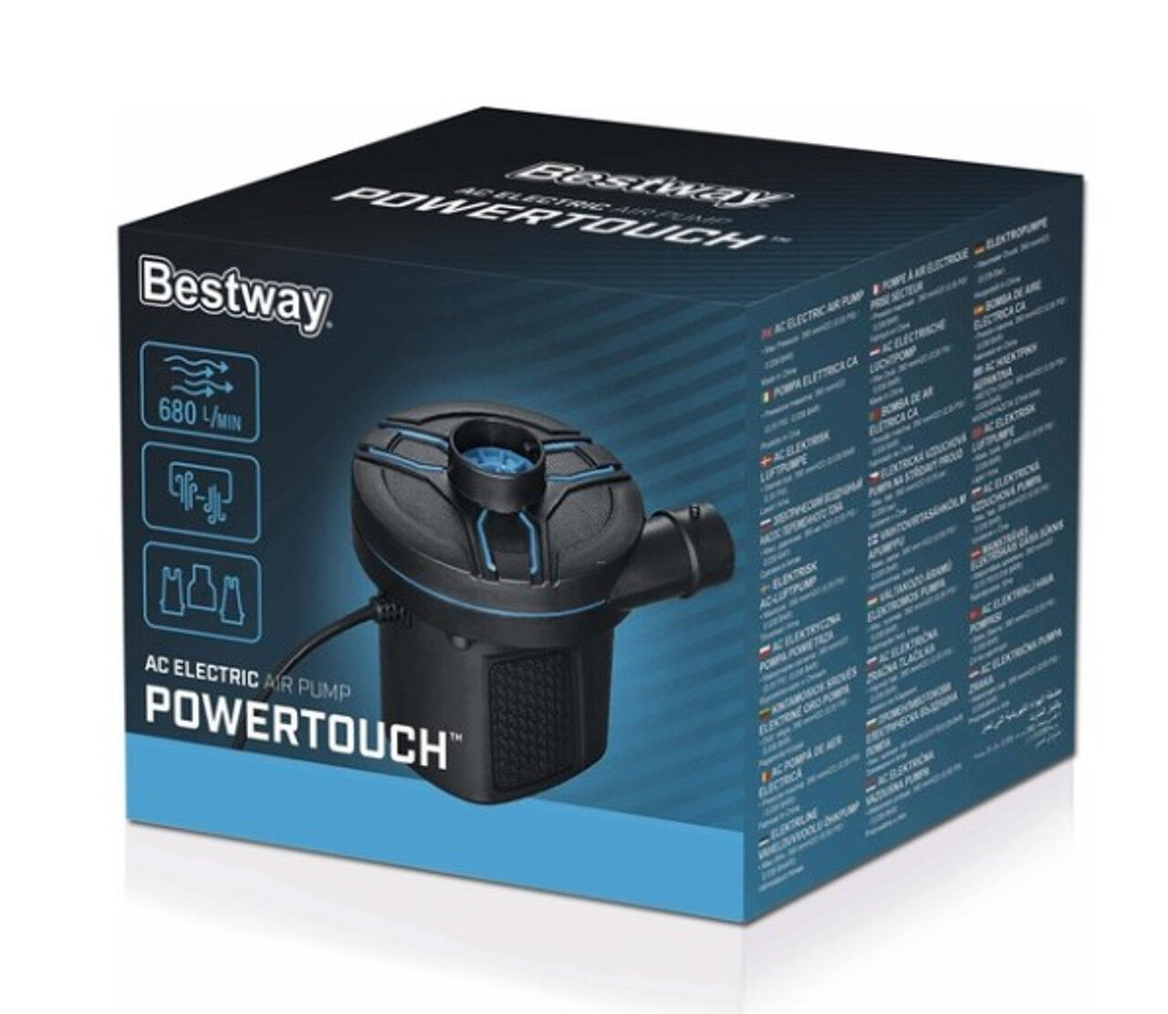The Bestway PowerTouch™ AC Electric Air Pump is a fast and convenient way to inflate or deflate your favourite inflatable products! This air pump comes with 3 multi-purpose valve adapters that are compatible with many products, including air mattresses, pool toys, camping mats, floats and more.