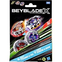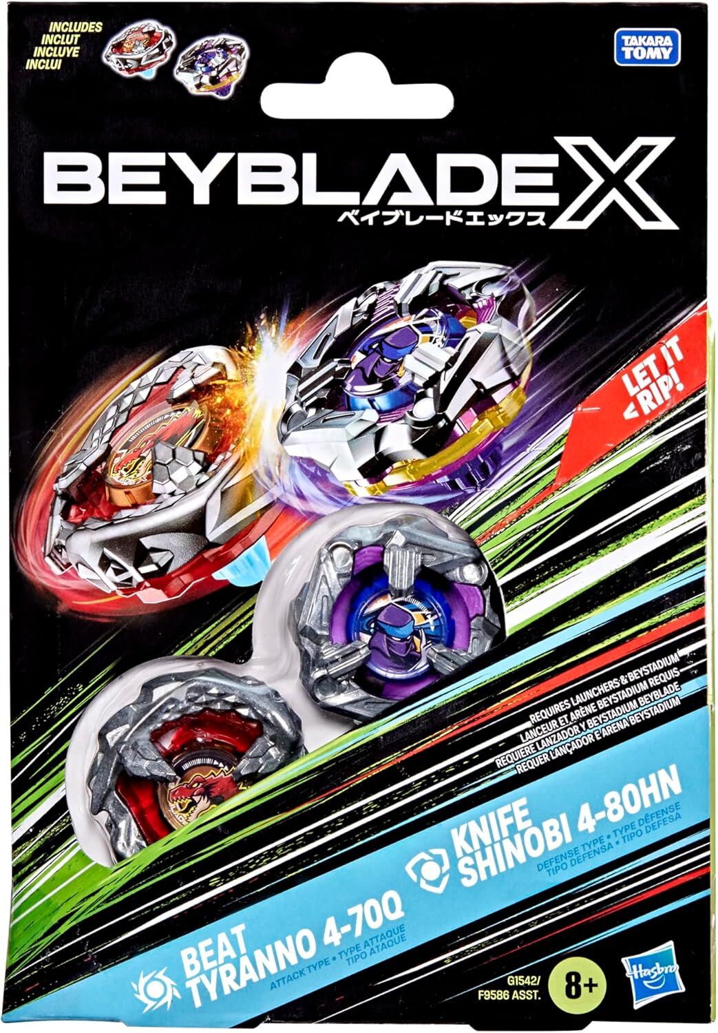 • INTERCHANGEABLE DIE-CAST BLADES: Includes Takara Tomy-designed Beyblade X top with authentic die-cast metal parts: Beat Tyranno 4-70Q Right-Spin Attack Type and Knife Shinobi 4-80HN Right-Spin Defense Type