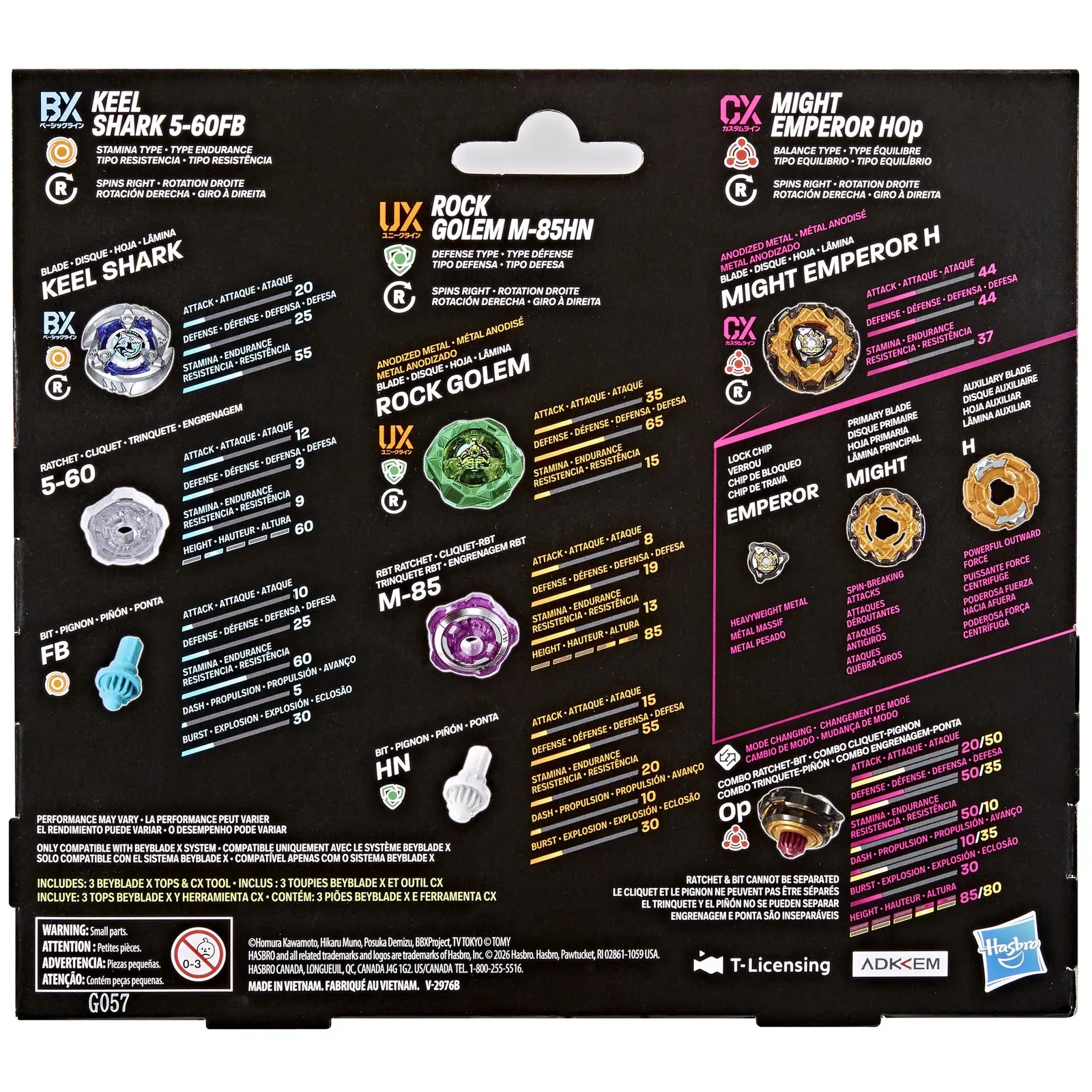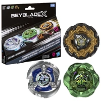 Get ready for epic battles with the Beyblade X X-treme Battlers Pack! This set includes 3 tops: Might Emperor HOp (Balance Type), Rock Golem M-85HN (Defense Type), and Keel Shark 5-60FB (Stamina Type) for nonstop action.