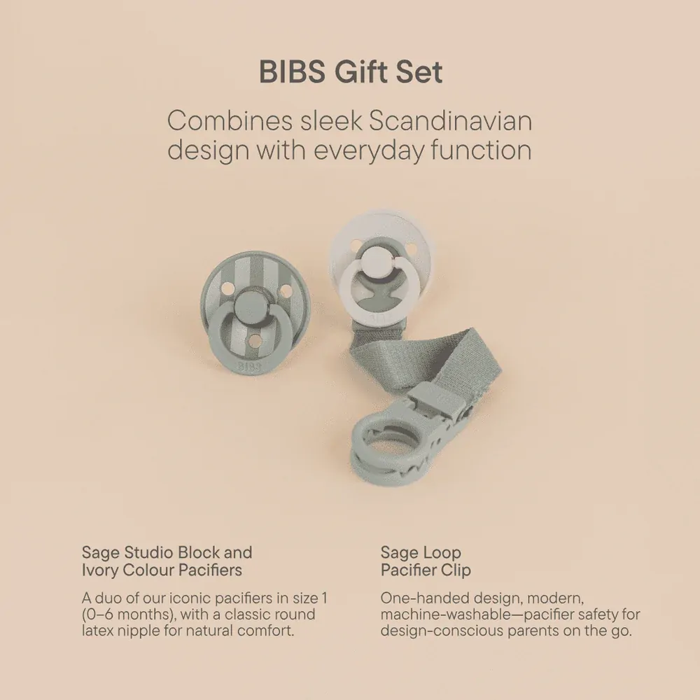 BIBS Gift Set is a sweet product bundle consisting of two BIBS Studio Collection Latex Pacifiers & Loop Clip. The perfect product combination for newborns, and ideal as a gift for baby showers, as a maternity gift, or for new or expecting parents who want the absolute best for their little one.