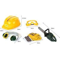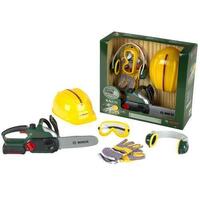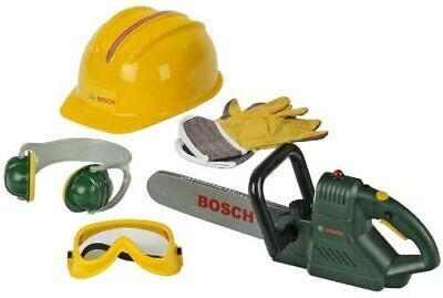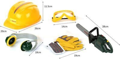 Bosch chain saw with helmet, work gloves, work goggles and earmuffs - with realistic sawing noise - flashing light during sawing function. Replica Toy with Play Functions.