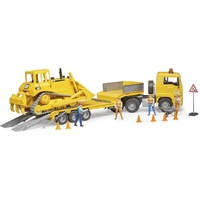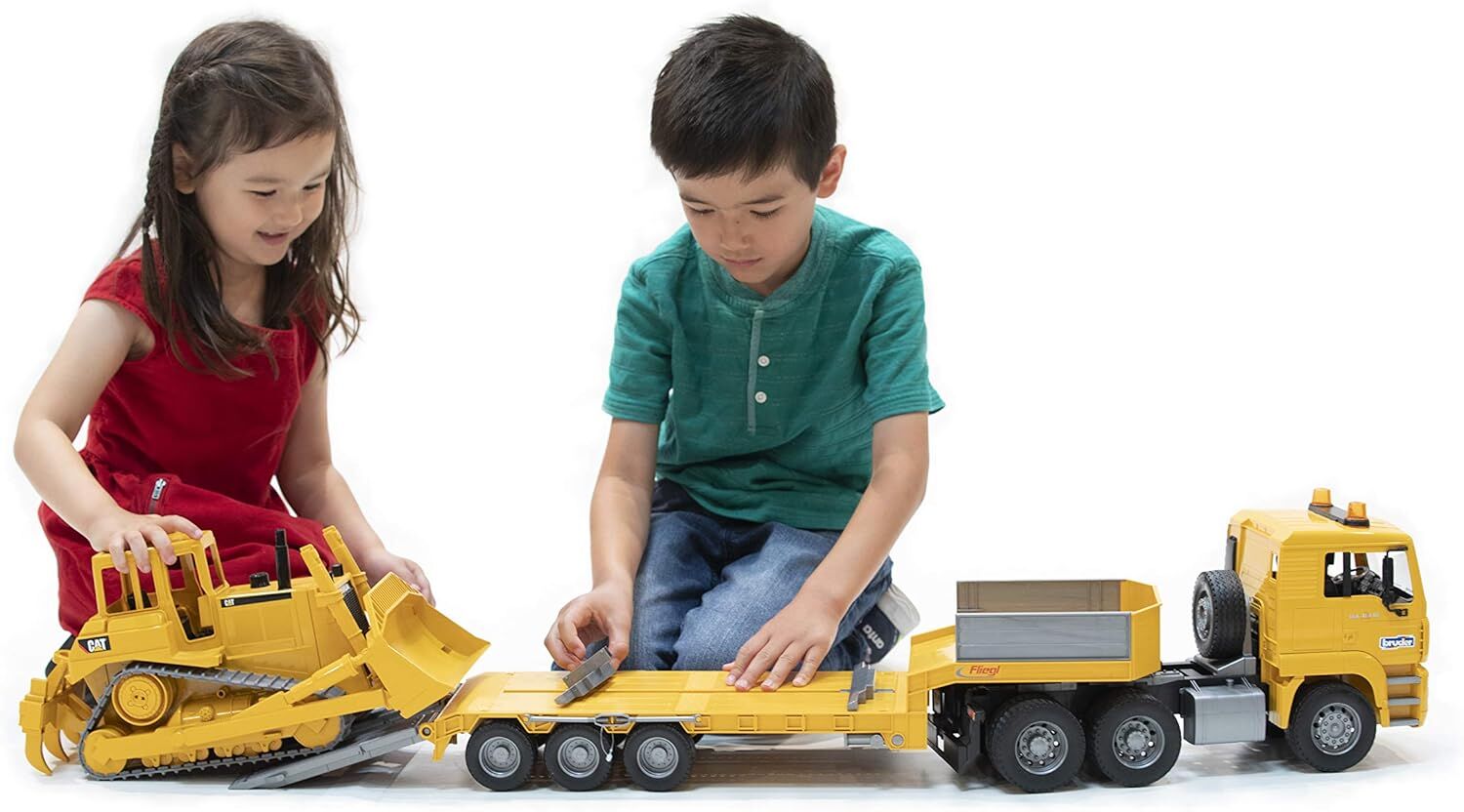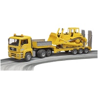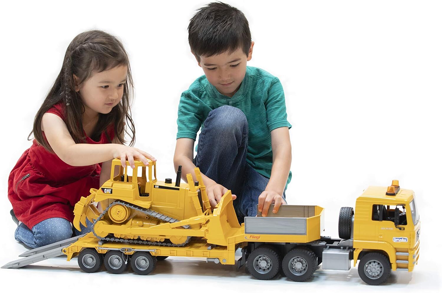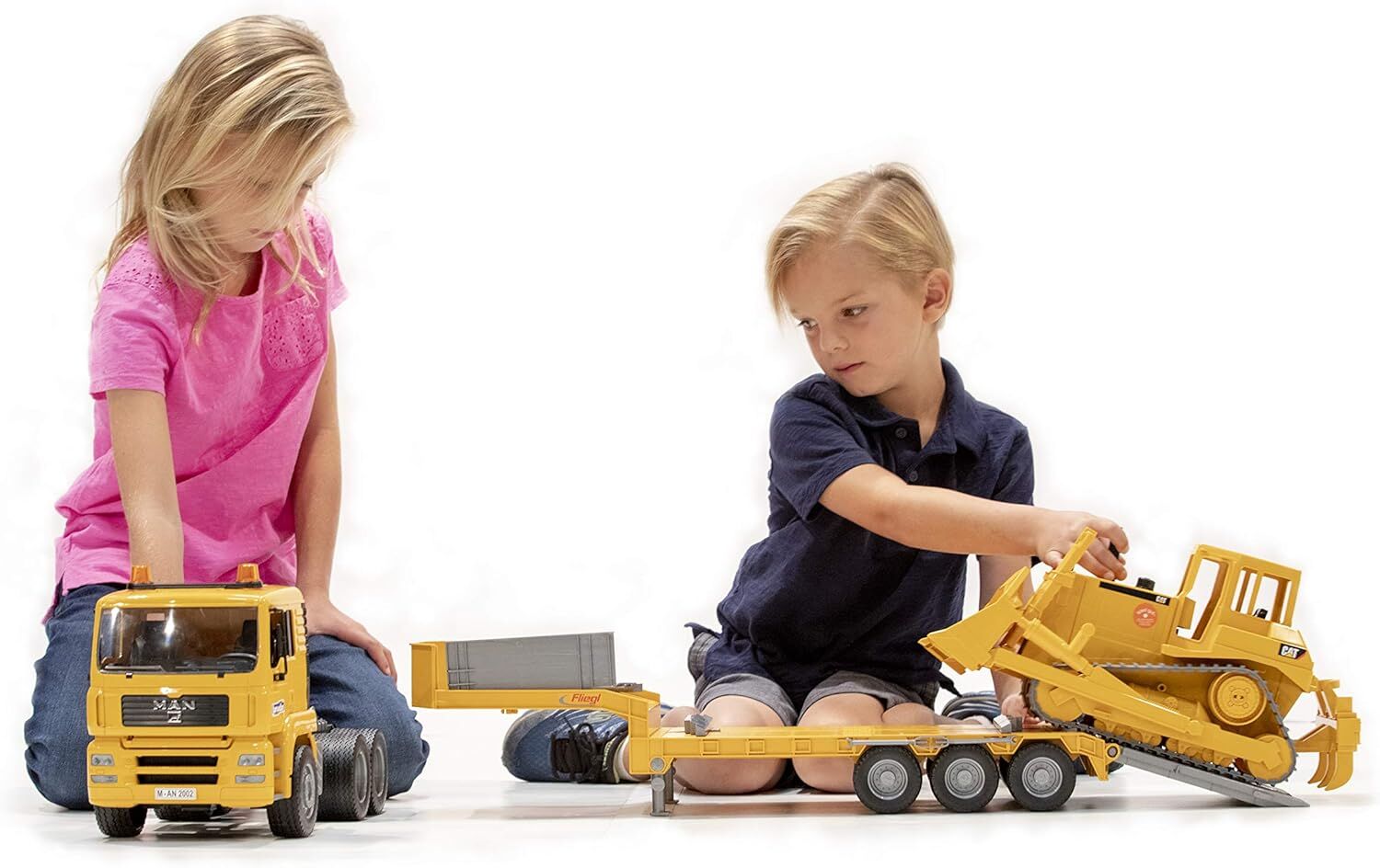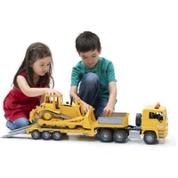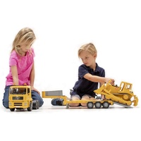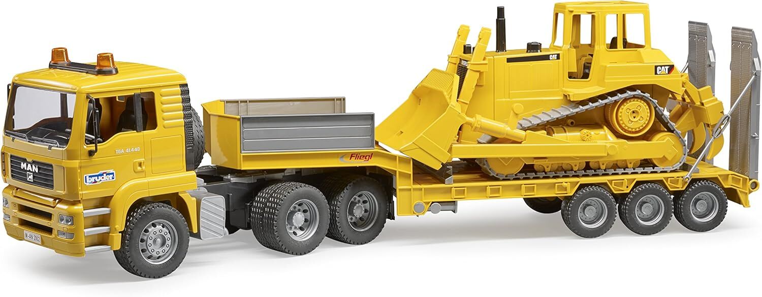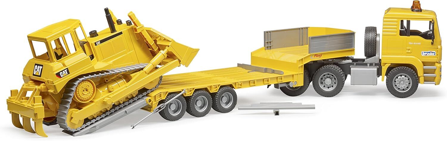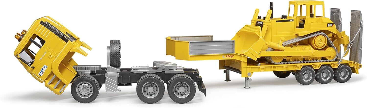 Bruder TGA Loader truck with CAT Bulldozer. Tipping Drivers Cab reveils view of engine block. Clip-on low loader with fifth wheel coupling and fold down loading ramps. Front screen made of transparent unbreakable polycarbonate. Fully functional front shovel excavator.