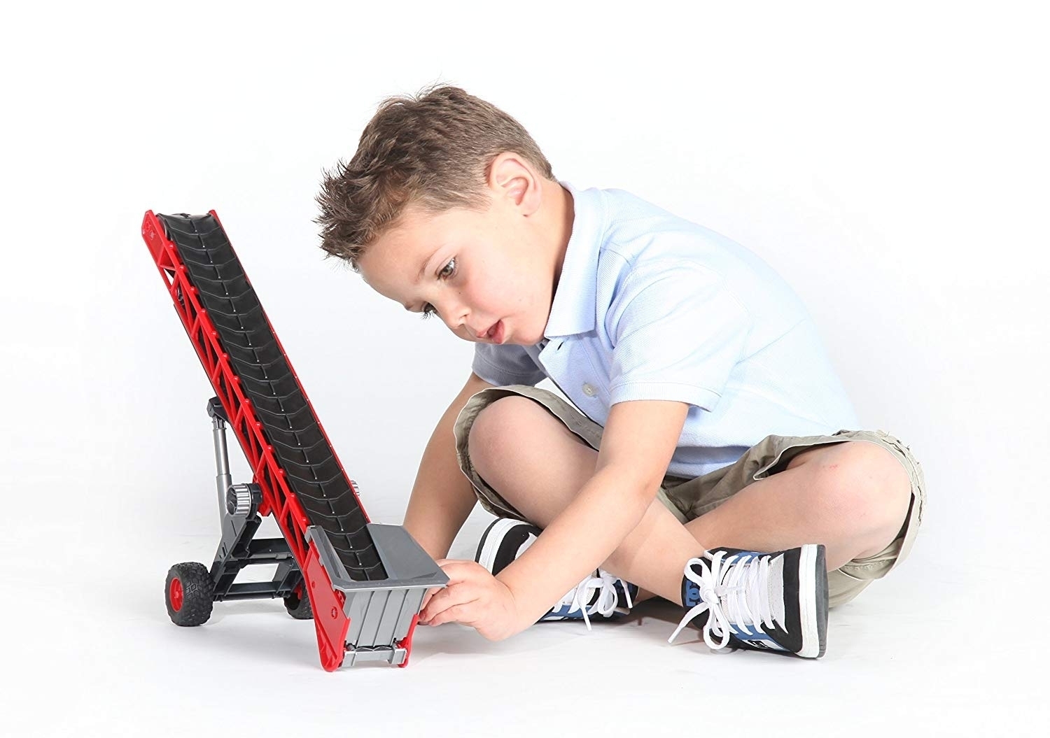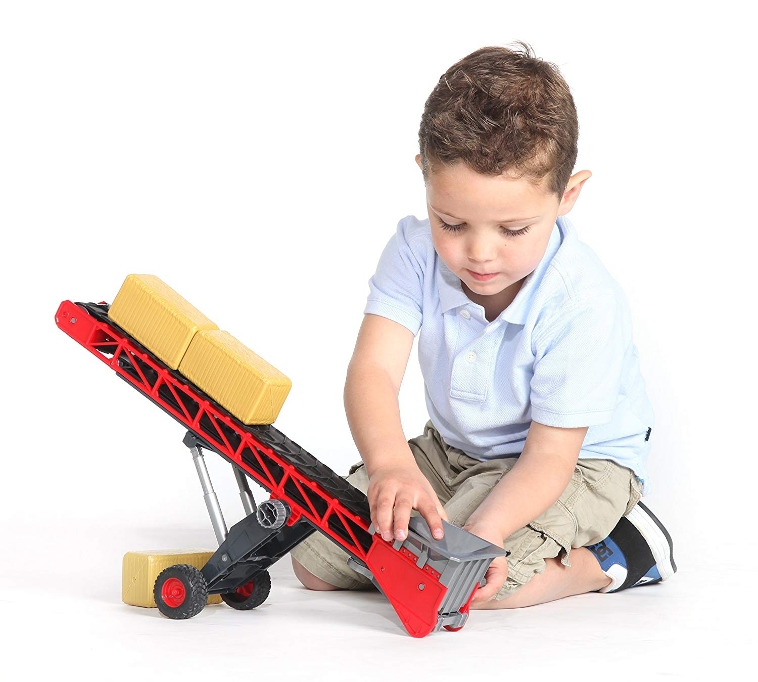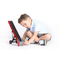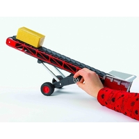 Since ancient times, Conveyor belts have helped men to transport, lift and lower heavy loads such as stones, timber, bulk material and others. To make it easier for our little master builders and farmers to complete their tasks, BRUDER is now launching a state-of-the-art conveyor belt. This tool distinguishes itself by its attractive design and its lifting and conveying mechanisms that are easy to use thanks to the installed crank. The mechanisms can be used to lift hay bales onto the trailer and transport them to the barn as well as transport and unload sand or rock on/from lorries. The conveyor belt can, of course, also be hooked on to all BRUDER towing vehicles such as tractors, Unimogs, lorries including the Sprinter and construction vehicles equipped with a drawbar coupling.