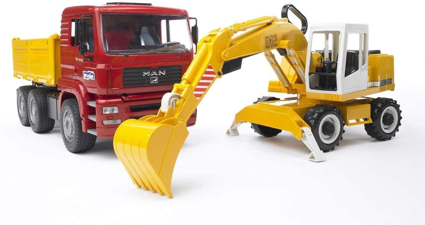 Use this Liebherr Excavator and MAN construction truck to move and transport earth. The sides of the construction truck fold down on three sides for unloading and the trough can be tipped and latched. The excavator arm is fully functional and the cab body and arm can be rotated through 360' on the chassis. Two support legs ensure stability. Bruder is a German company whose products are developed as model-sized toys. These high quality toys encourage children to imitate real life in the form of role playing. The high level of functionality of the toys help children understand the technical world by allowing them to "grasp by grabbing. " Special attention is paid to the well-balanced interaction of easy-to-handle play functions and models that are true to life and offer the greatest possible level of stability.