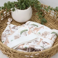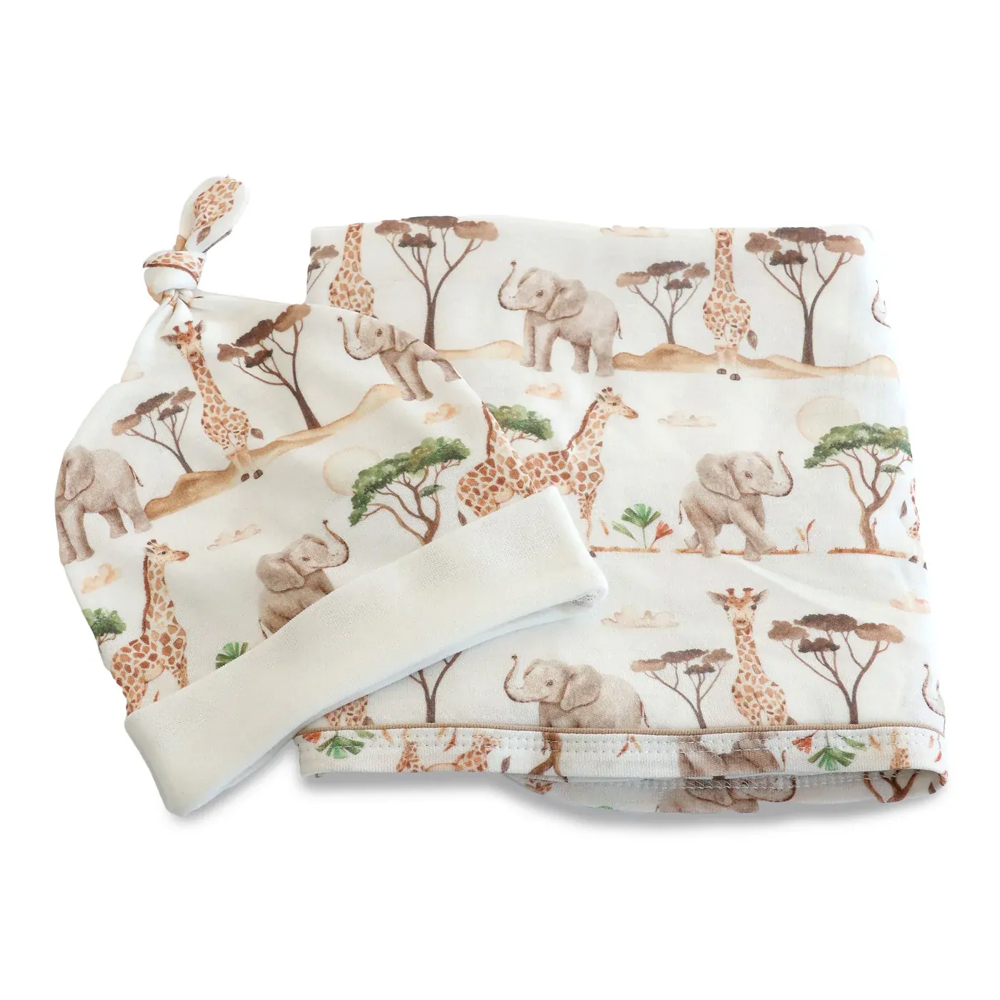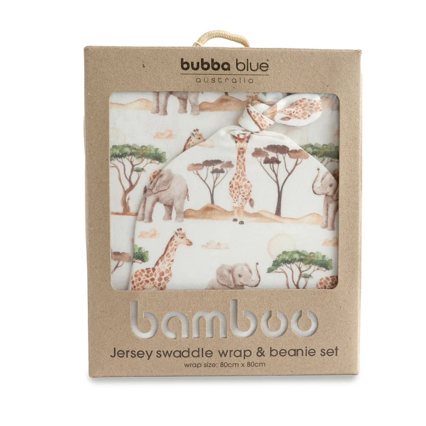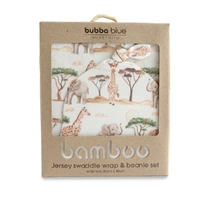 This gorgeous jersey wrap with matching knotted beanie are sweet and stylish for your baby. Printed jersey swaddle wrap with the newborn size beanie from the Bubba Blue Adventure Collection are made from soft jersey for comfort and have just the right amount of stretch to keep your little one cosy and well wrapped.