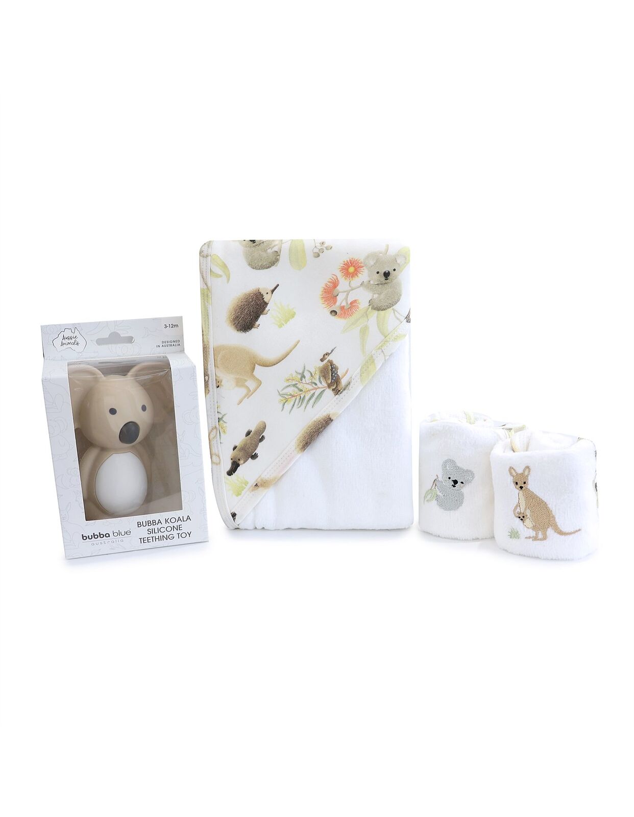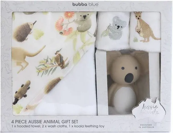 We’ve made gifting easy with our Aussie Animals gift set that little ones will love, featuring a gorgeous illustrated hooded towel, 2 x wash cloths featuring Australian animal characters and our super cute Bubba Koala teething toy.