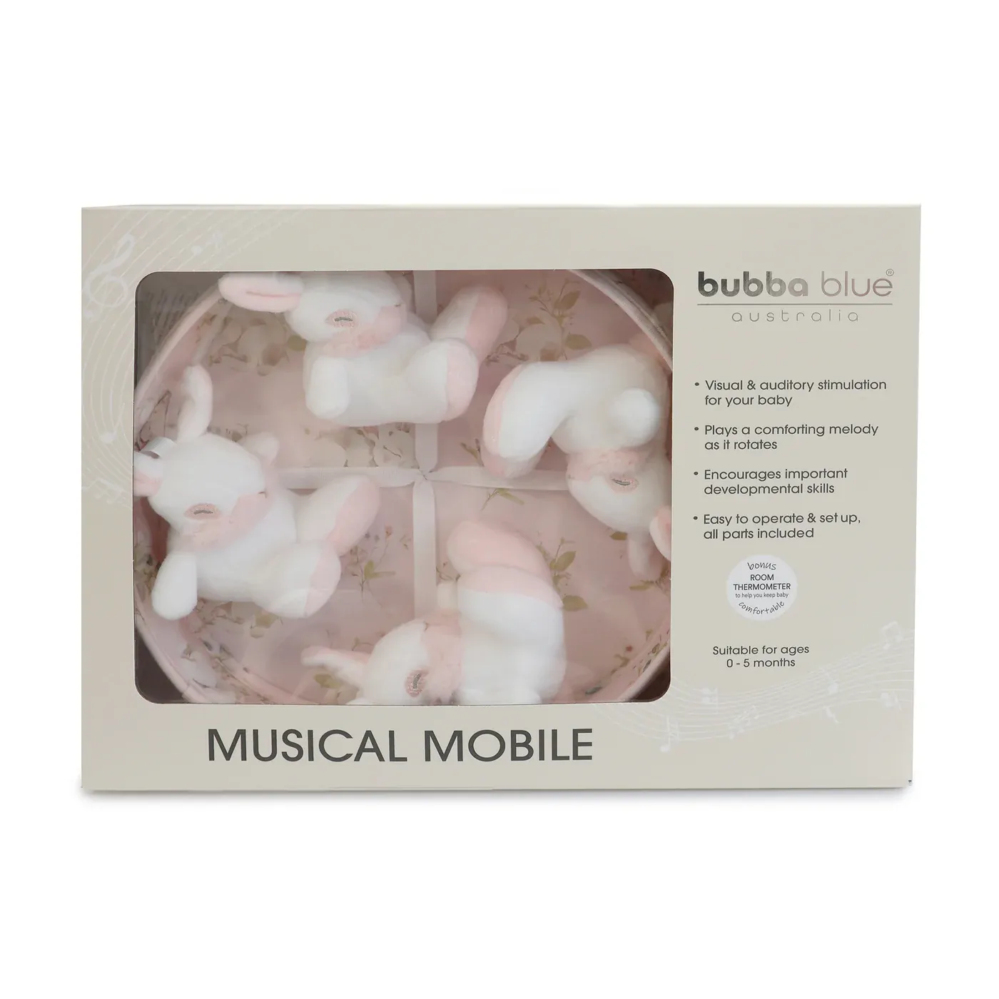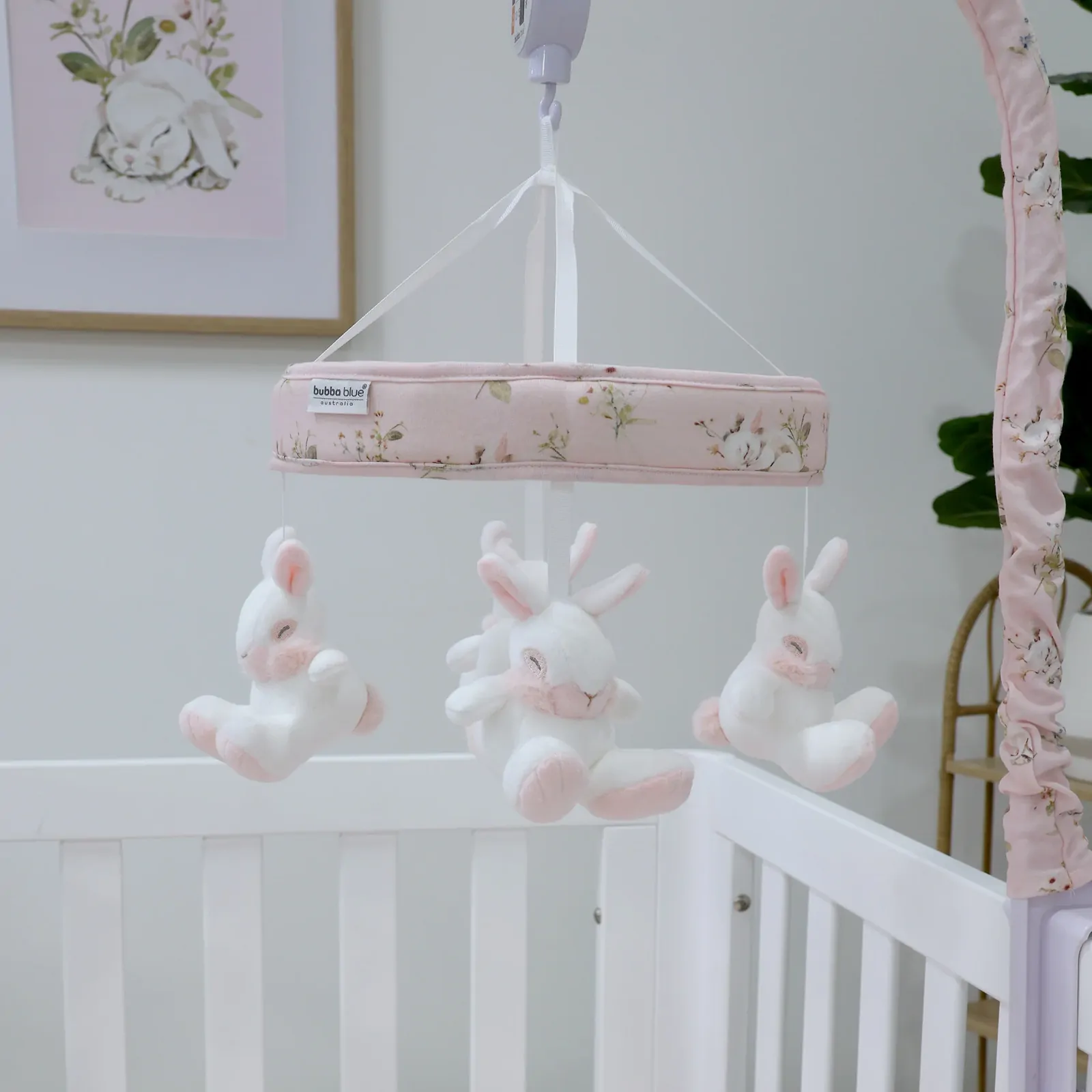 Gorgeous musical mobile featuring adorable sleepy bunnies is sure to delight little ones.