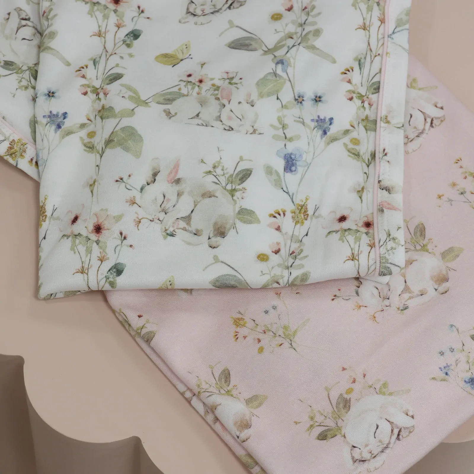 Nestled in a soft bed of dandelion fluff and dew-kissed clover, the bunnies yawned wide, eyes slightly droopy, welcoming the soothing embrace of the night. Featuring soft pastel pinks with some mint and blue highlights,
