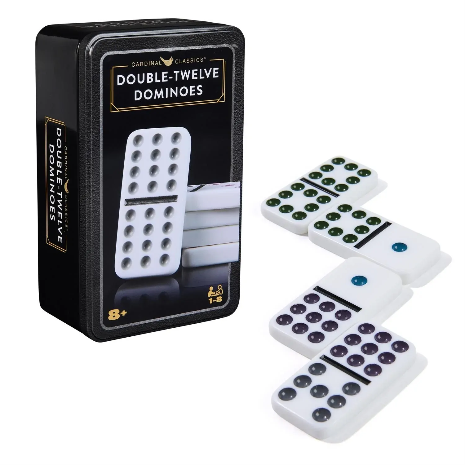 Bring some old-fashioned family fun to game night with this high quality Dominoes set. Double Twelve Dominoes is perfect for beginners and experts. The starter piece enhances gameplay while the bright coloured dots make gameplay easier. Train enthusiasts will love the brightly-coloured toy trains. This Double Twelve Dominoes set includes 91 durable, colour dot, ivory-coloured dominoes that stack neatly into a durable storage tin, a starter piece, and 4 plastic trains. Learn to play different variations with the included instructions.