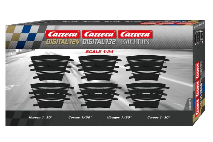 If you Carrera own a Carrera 1:24 scale track, this track element is just the thing for expanding it. The package contains six curve pieces, each at 30°. When you connect them all together, you create a large curve totaling 180°. First, speed through long straight sections, show off your driving skills in the loop, and tackle the jump with flying colors, then outmaneuver your opponent in the curve. Because as a slot car pro, you surely know exactly how much speed and finesse you need to steer your car through the curve. These curved sections are the perfect addition to your Carrera DIGITAL 124 , Carrera DIGITAL 132 , or Carrera EVOLUTION.