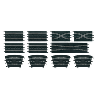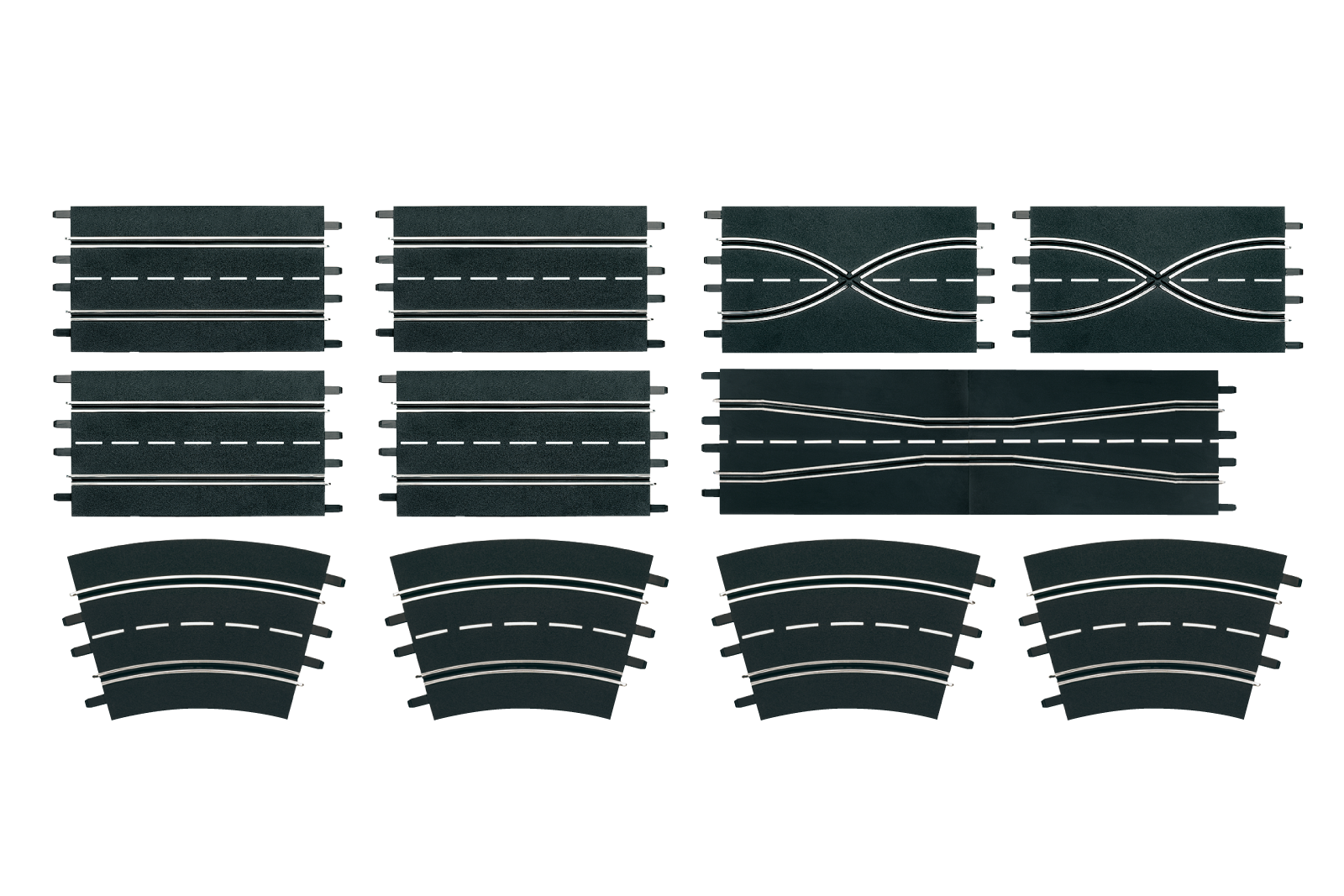 In the course of time, you will also become fixated on making your Carrera race track more and more versatile and exciting. But what's the best way to do that? As a first step, we recommend the use of additional track components. These allow you to construct your track anew and extend it with additional elements. In this extension set you will find many different tracks that will support you in your "rapid Carrera race track” project. Four standard straight sections, two lane changes, two narrow section tracks and four cornered sections with 2/30°, as well as the matching track locking mechanisms come with this set to your home. All included track parts are on a scale of 1:24 and can therefore be used for the Carrera DIGITAL 124, the Carrera DIGITAL 132 and the Carrera EVOLUTION race tracks.