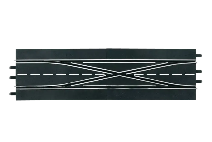 A turnout on the racetrack opens up whole new possibilities. On digital Carrera tracks, turnouts allow you to change lanes. With a double switch, both cars can even change lanes at the same time. However, they shouldn’t do this simultaneously, as it can quickly lead to an accident. Used tactically, changing lanes allows you to drive in your opponent’s slipstream or slow down the competition. The double switch consists of two individual parts and has a scale of 1:24. It can be used to upgrade an analog Carrera EVOLUTION track.