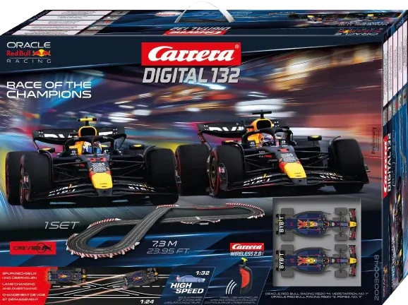 With the Carrera DIGITAL 132 “Race of the Champions” set, fans can experience the thrilling racing moments between Max Verstappen and Sergio Pérez from the 2024 Formula 1 season up close in the comfort of their own homes. On the 7.3-meter-long track, the highly detailed Red Bull Racing RB20 “M. Verstappen, No. 1” and “S. Perez, No. 11” face off in action-packed head-to-head duels. Thanks to the WIRELESS 2.0 handheld controllers, drivers experience maximum freedom and precise control. Up to 6 drivers can battle simultaneously for a spot on the podium—adrenaline-pumping moments guaranteed. The thrill of fighting for every second on the track and the excitement of a real Formula 1 race become tangible—even without sitting in a cockpit. A must-have for all Formula 1 fans who want to experience the rivalry between Verstappen and Perez up close.