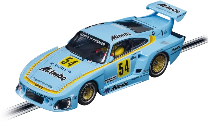 The Carrera EVOLUTION Porsche Kremer 935 K3 “No. 54” is the miniature version of the legendary race car with which Klaus Ludwig won the DRM championship in 1979. In addition, this innovative Porsche model won the Manufacturers’ World Championship four years in a row, making the Porsche 935 one of the most successful production-based race cars in history. The original vehicle boasts a record-breaking 680 hp and was driven by racing legend Klaus Ludwig, affectionately known as “King Ludwig” by his fans. He is still considered Germany’s most successful touring car driver to this day.