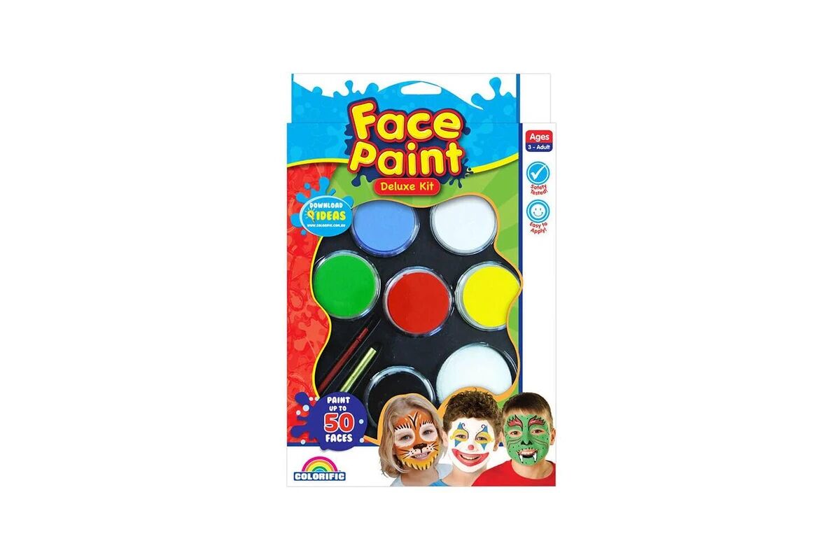 This Colorific Face Paint Deluxe Kit is the essential kit to complete any fun costume, with your imagination being the only limit. Included in this kit are 6 colours, a detail crayon, brush, sponge, and mixing guide. It allows you to paint up to 50 faces with safe, non-toxic paint that is simple to wash off with soap and water.