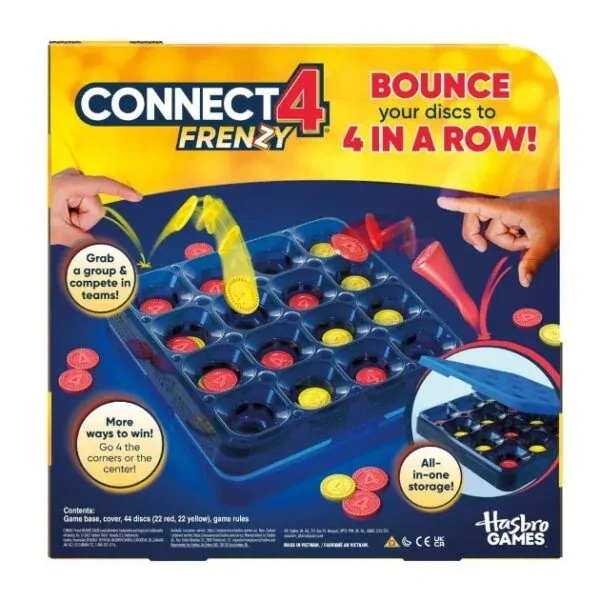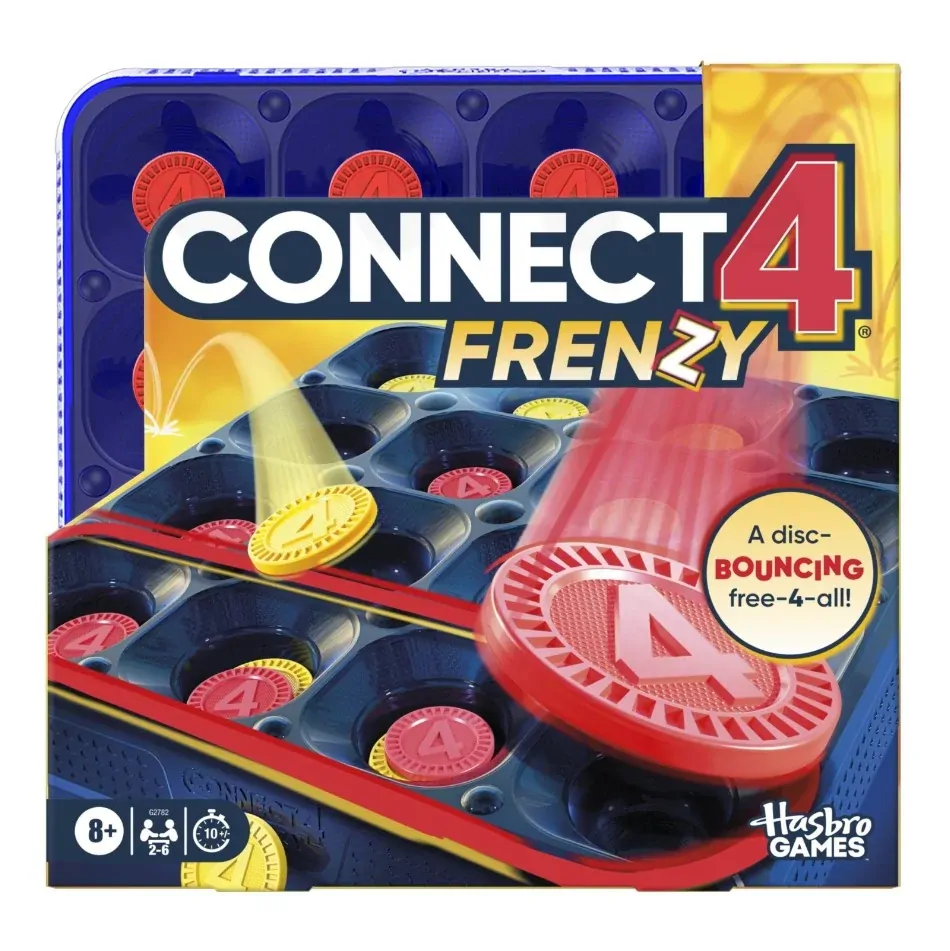 Everyone plays at once in the Connect 4 Frenzy game, an exhilarating, fast take on the original Connect 4board game! Instead of dropping discs, players go for 4 in a row by bouncing them off the table and into spots on the grid. If a team’s disc lands in an opponent’s spot, they get to steal it! In this unpredictable game, the lead can change within seconds, as players sink discs, swipe spots, and sabotage opponents. Want to amp up the challenge? Try more ways to play: go for just the corner or center spots.