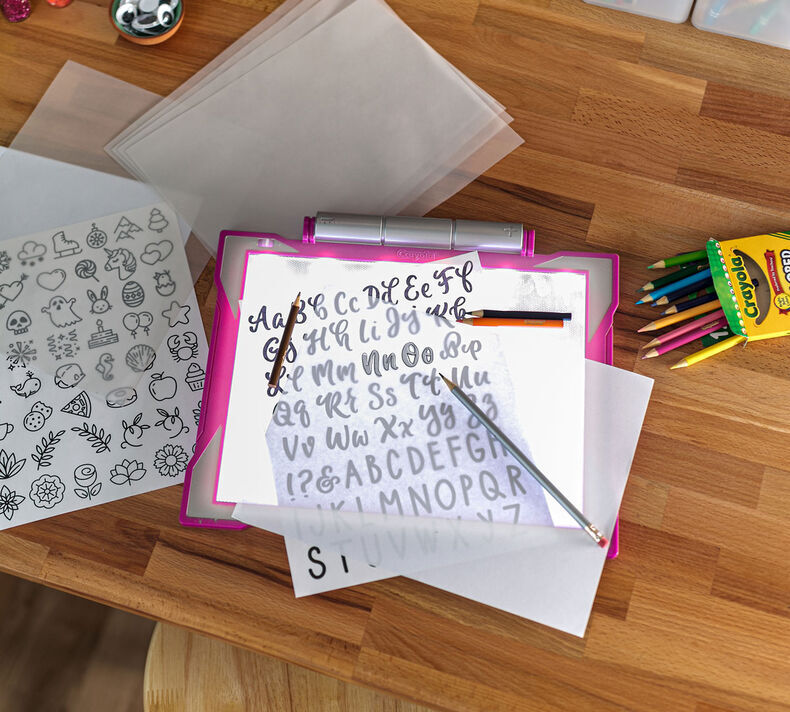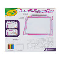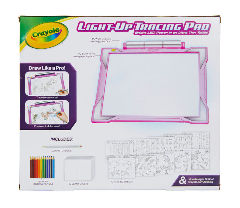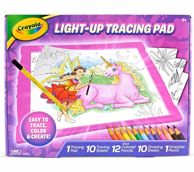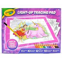 CRAYOLA LIGHT UP TRACING PAD: Features Pink Colouring Board, 1 Graphite Pencil, 12 Short Coloured Pencils, 10 Tracing Sheets, and 10 Blank Sheets. 3 AA batteries required - sold separately.