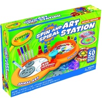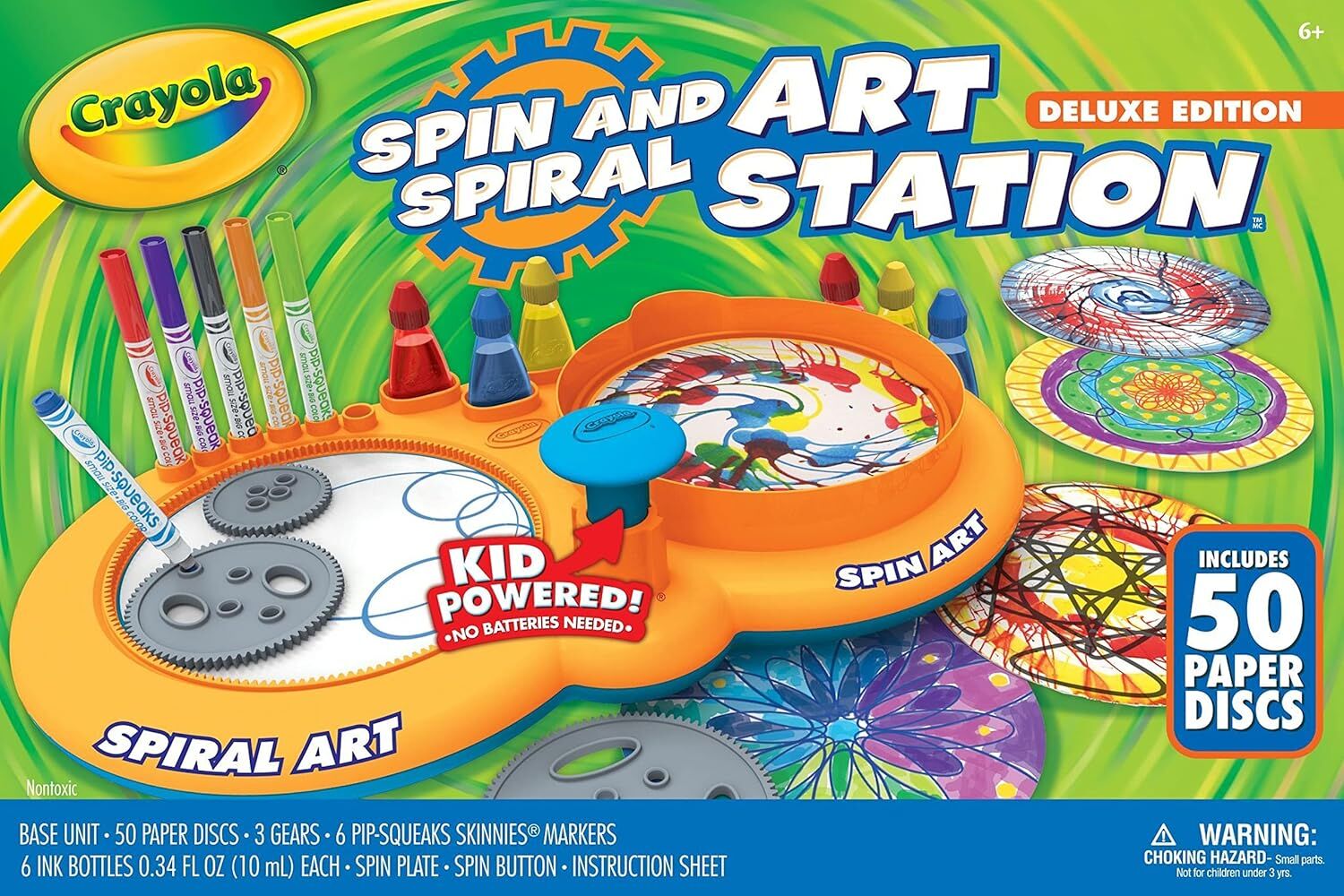 • INCLUDES: 1 Spin & Spiral unit in blue and orange, 50 Paper Discs, 6 Bottles of Drip Ink (2ea. R/B/Y), 6 CRAYOLA Pip Squeaks Markers, 3 Spiral Art Gears, 1 Removeable Spin Art Plate, and 1 Instruction Guide.