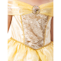 • Exquisite dress with a gold foil velour bodice and featuring an organza shoulder peplum with character pendant at the centre