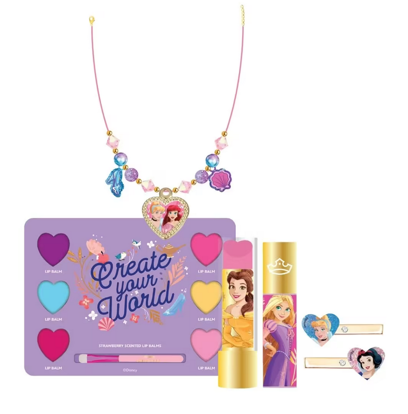 • Includes 1 x lip gloss, 1 x lip balm, 1 x lip balm palette, 1 x charmed necklace, 2 x hair clips and 1 x make-up brush