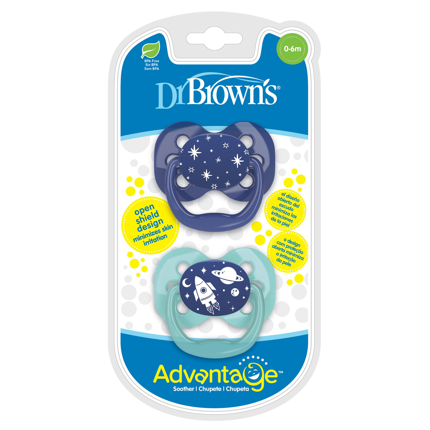 Get the Dr. Brown's Advantage - the soother designed with baby's acceptance in mind! The Advantage Soother is a fully symmetrical soother, with reversible bulb that fits in baby's mouth either right-side up or upside down. The 100% silicone bulb is soft but sturdy, using a rounded shape that satisfies baby's suckling reflex. A unique shield design reduces irritation by providing plenty of air for baby's sensitive skin to breathe. Advantage Soothers grow with baby, coming in two stages to fit developing faces. Taste-free, odour-free, and BPA-free. Quickly clean in the dishwasher (top rack) or sterilize by boiling, microwave, or electric sterilizer.