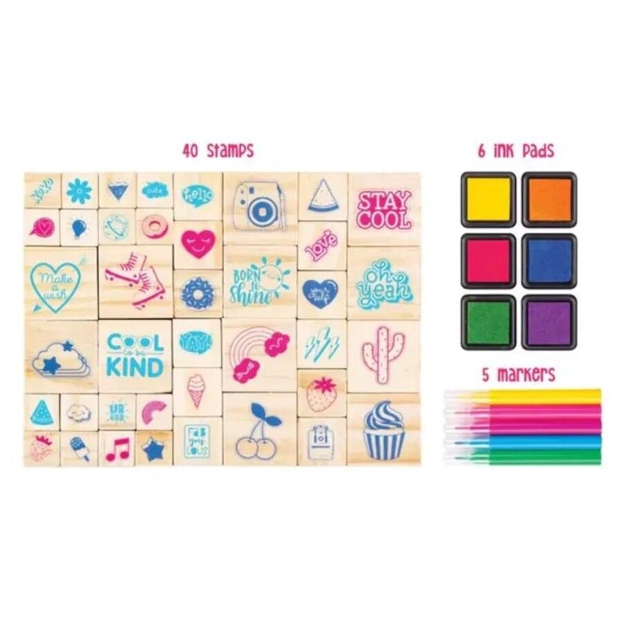 Spread positivity and kindness with this fun-filled set of 40 ink stamps! Featuring cheerful designs and uplifting phrases, these colourful stamps celebrate that it's cool to be kind. With six ink pads and five markers, this delightful collection encourages good vibes and creative play.