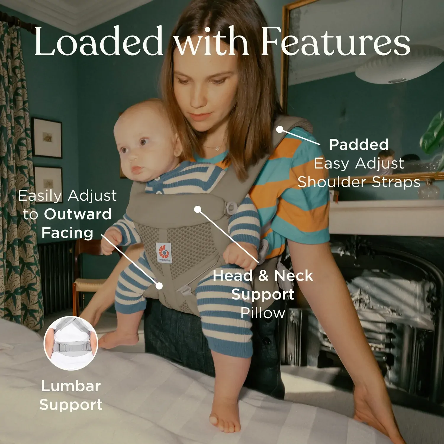 • Four carry positions - Front-inward, front-outward, hip and back carry