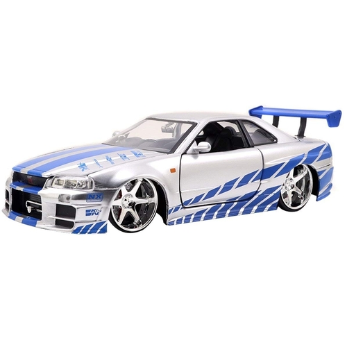 Brand new 1:24 scale diecast model car of Brian's Nissan GTR Skyline R34 Silver/Blue "Fast & Furious" Movie Diecast car model by Jada.