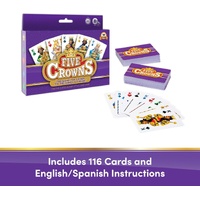 Five Crowns is a five-suited rummy-style card game. This award-winning, classic game is a quick favorite for both avid and casual card players. Five Crowns features a unique double deck that contains 5 suits: spades, clubs, hearts, diamonds, and stars. This special deck makes it easier to arrange your entire hand into books and runs. The rotating wild card keeps players on their toes! The game begins with 3 cards and 3s are wild, the next round has 4 cards and 4s are wild and so on ‘til the Kings go Wild! Make the right combinations, be the first to go out, then watch players scramble as they get one last chance to cut their losses! Five Crowns is loved by everyone, easy to play anywhere and a game that you’ll want to play again and again!