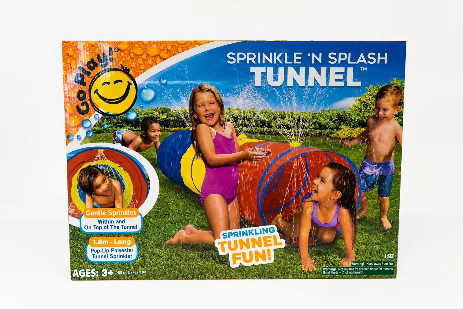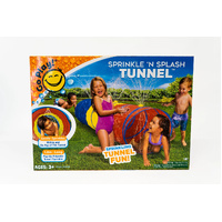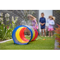 Splash around in the long pop up polyester tunnel sprinkler as water gently sprays within and on top of the tunnel.