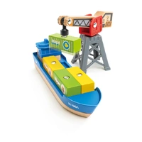 Encourage exploration, problem-solving, and teamwork with the Cargo Ship & Crane Playset. Children can role-play as dock workers, sailors, or crane operators as they use the magnetic crane to lift and load containers onto the ship, preparing goods for delivery around the world. The ship features wheels for easy movement and can be connected with other Hape railway sets to extend imaginative play.