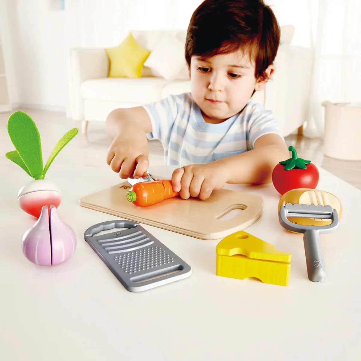 It’s time for dinner! Help to get things ready by trimming, peeling and chopping the vegetables and grating the cheese on your own cutting board.