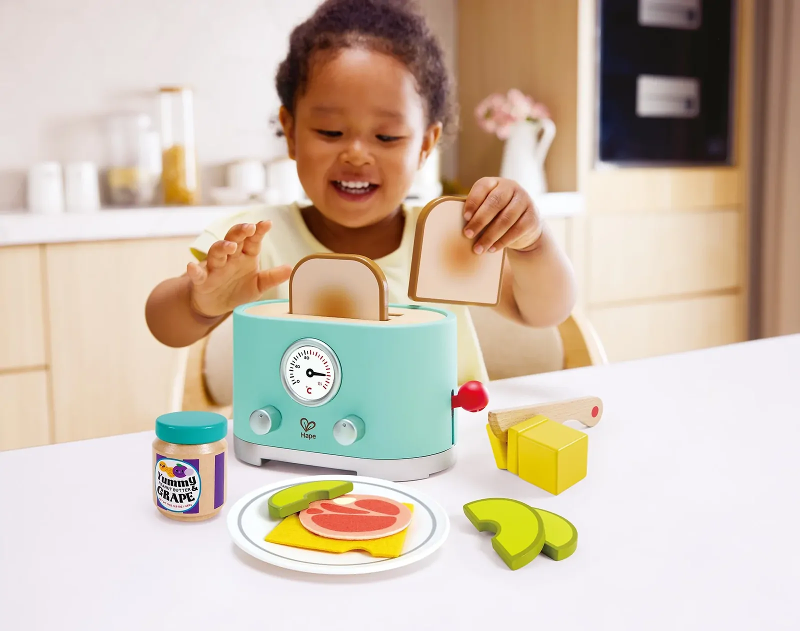 • FULL OF ACCESSORIES: This set includes one toaster, two toast pieces, three avocado slices, `sliceable` butter, jam, ham, cheese, one knife and a plate.