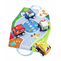 Zoom into fun with the Pull-Back Plush Car Set, featuring a fire truck, police car, ambulance, and taxi—each driven by a friendly animal character. Made from soft, toddler-safe plush and equipped with durable pull-back motors, these cars race quietly across the floor. The fold-out storage bag doubles as a play mat.