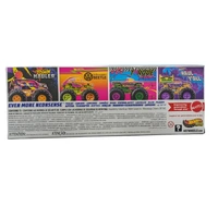 The Hot Wheels Monster Trucks themed 4-pack of 1:64 scale trucks is ready to crash and smash into any collection with giant wheels and awesome designs! The four trucks come in a window box to show off their sweet deco's, and every package provides each truck's stats including name, truck type, strength, unique crash attack and motor-vation for great storytelling fun! There's also one exclusive Monster Truck in each pack! Great gift for kids ages 3 to 6 years old. Each pack sold separately, subject to availability. Colours and decorations may vary.