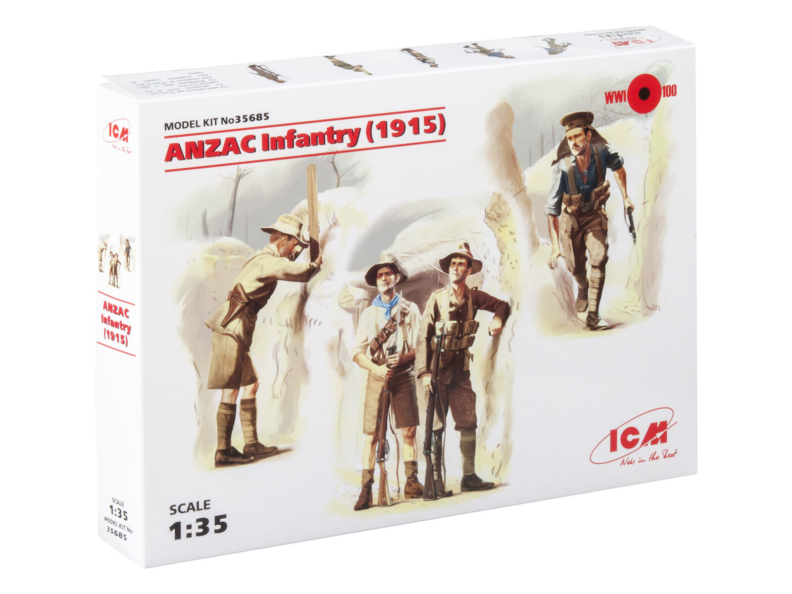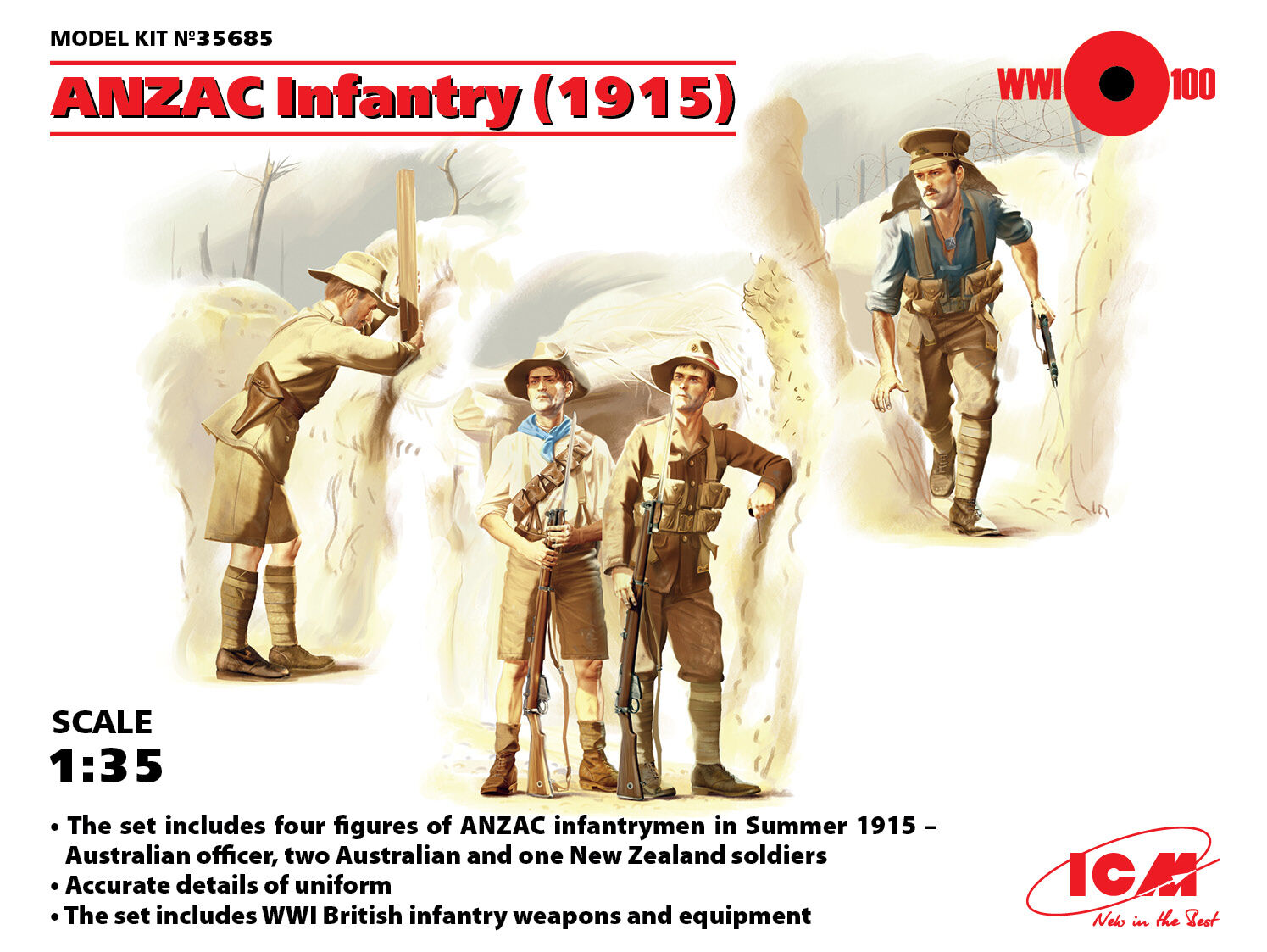 The set includes 48+74 parts for assembly 4 figures of ANZAC Infantry of 1915 period.