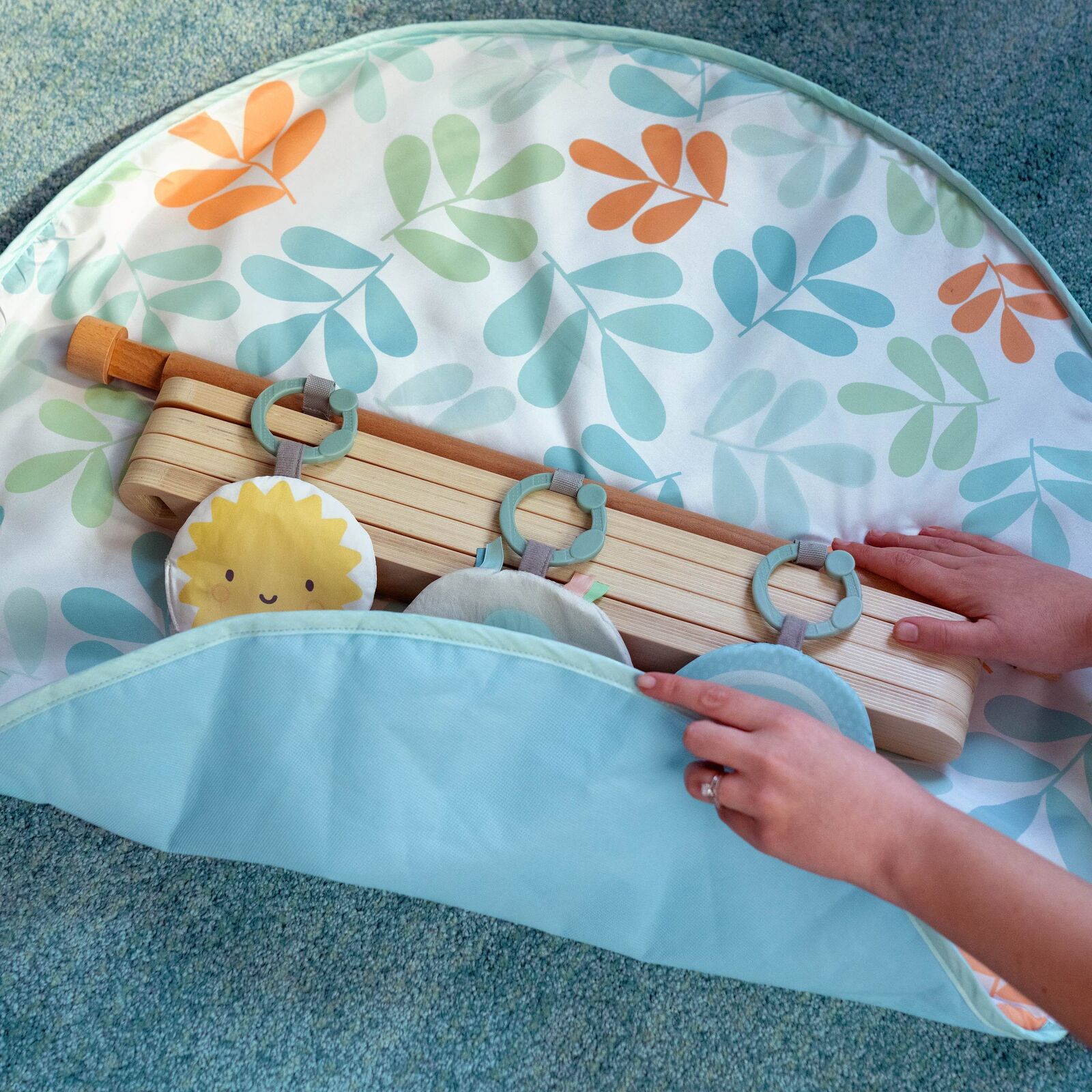 The nature-inspired Ingenuity Sun Valley Wooden Toy Arch & Play Mat is baby's new "park" and play fun zone!