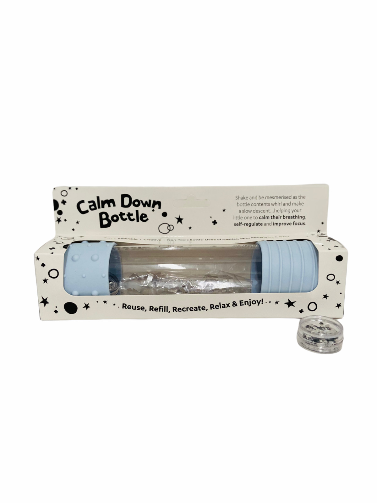 Jellystone Designs' award-winning DIY Calm Down Bottle is a unique sensory bottle, where you receive all the creative elements required to create a sensory bottle perfect for your child. Just add warm water and a dash of washing-up liquid and it's ready to go! With this option, you can refill and reuse the sensory bottle for endless creative options.