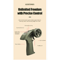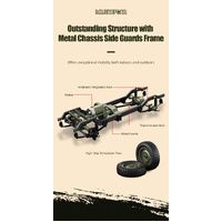 • Realistic Design: Featuring LED headlights, tail lights, and turn signals, this RC crawler offers independently controlled lights and a roof spotlight for enhanced realism.