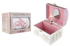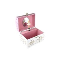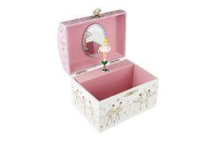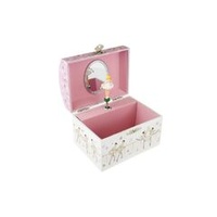 Children will love this magical musical jewellery box from Kaper Kidz. It is sure to put a smile on their faces when they open the lid as they watch the ballerina twirl to the music playing within. Each jewellery box is covered in beautifully illustrated pictures of dancers, ballerinas and more so you can proudly display this jewellery box on any shelf or table. On the back of each box is a small handle that can be wound up to play the music hidden within the jewellery box. The music will only play once the lid is opened and the figurine will spin along to its tune. Each box has been flocked inside with soft velvet fabric , to keep precious things safe . Behind the spinning figurine, a mirror features to show off the figurine as it spins. This music box plays to the tune of blue Danube. Each musical Jewellery Box from Kaper Kidz is designed as a decorative object for sorting and displaying precious items.