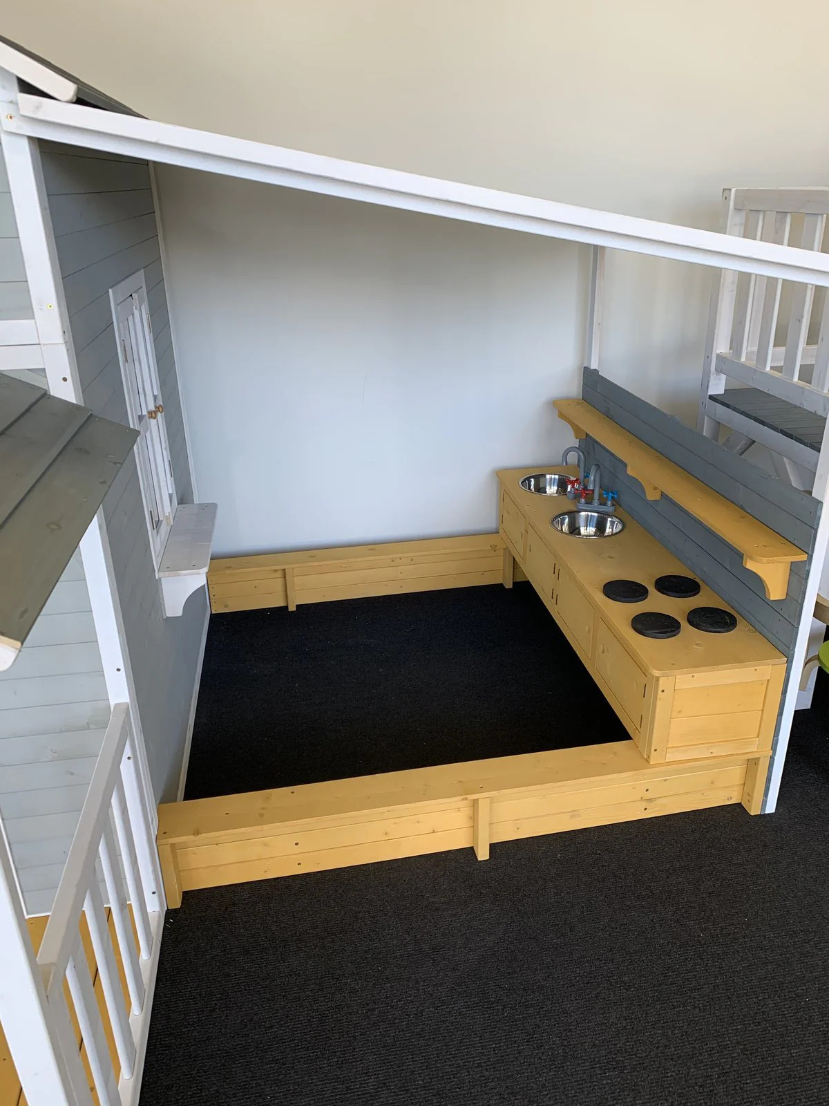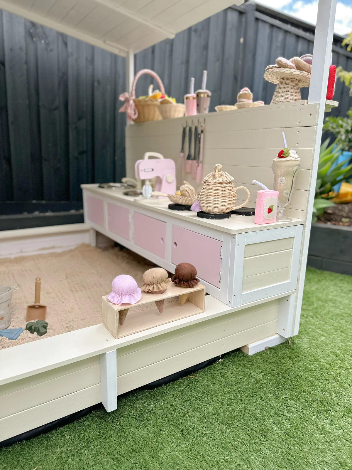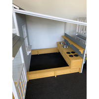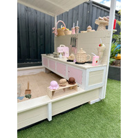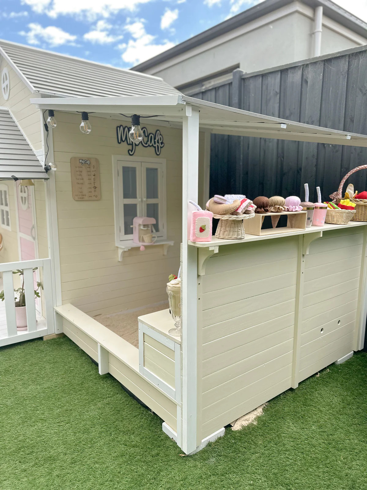 Our Lovely Shack is a large ground level cubby with opening windows with shop shelves, 1.2m High Door, Large Verandah with fence and letterbox included. A Taller Cubby, so even an adult can stand inside!