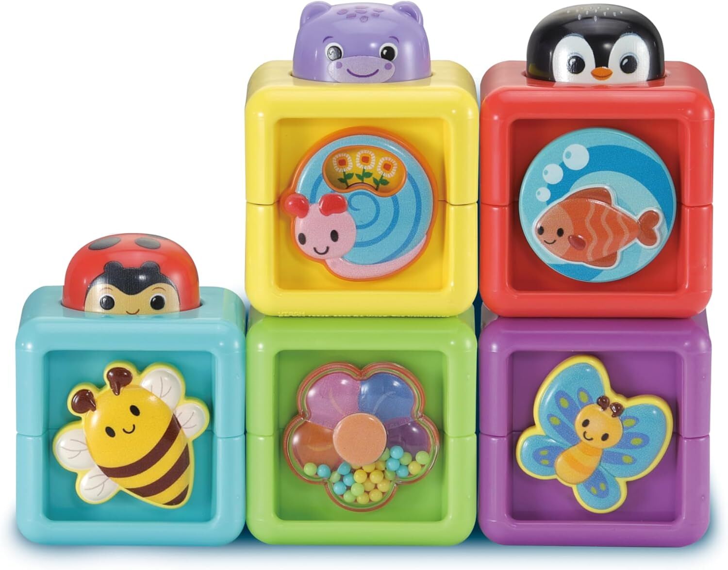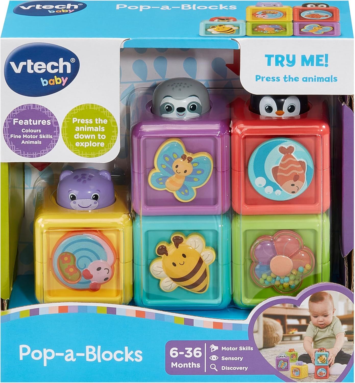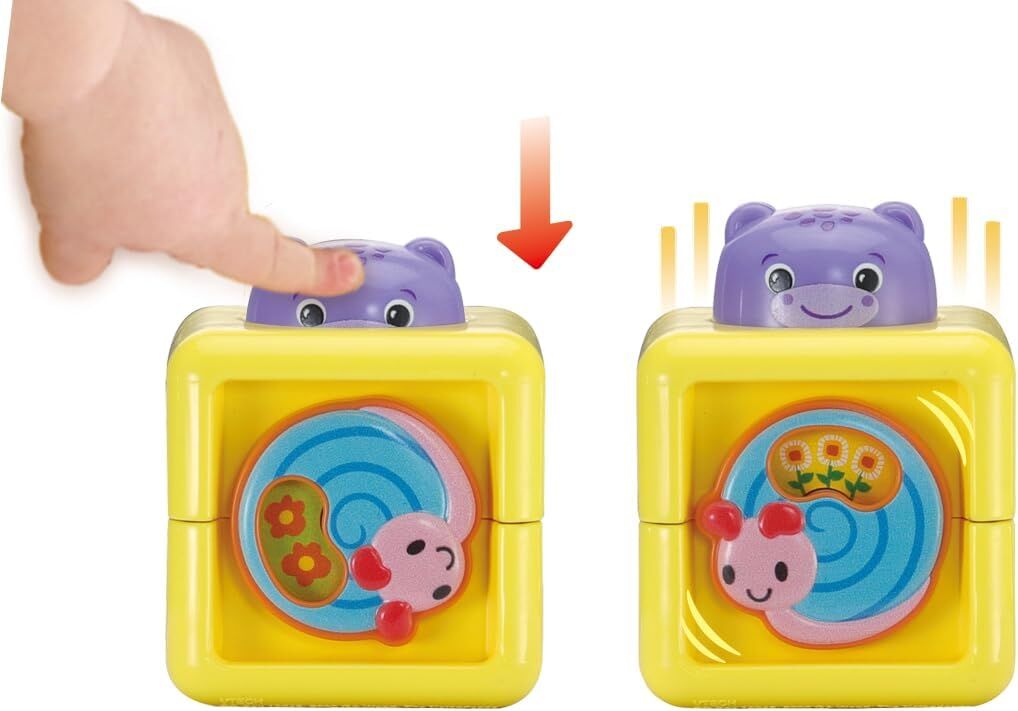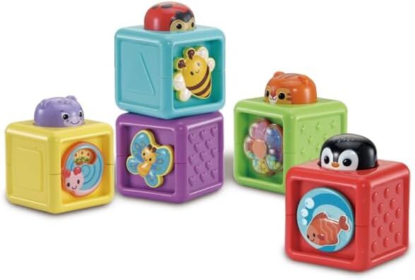 Discover endless fun and learning with the colourful Pop-a-Blocks! Each of the five vibrant blocks is designed to engage young minds through numbers, shapes, textures, and surprise interactive features.
