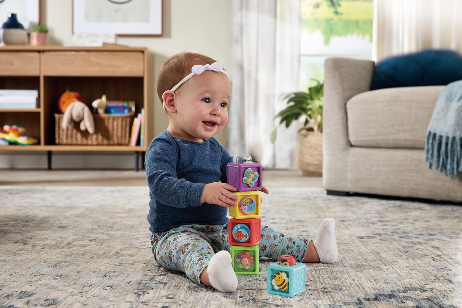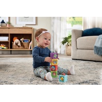 Little ones will love exploring cause-and-effect as they twist, push, rattle, and roll each block. Whether stacked high or toppled over, these blocks support both fine and gross motor development while encouraging sensory exploration.