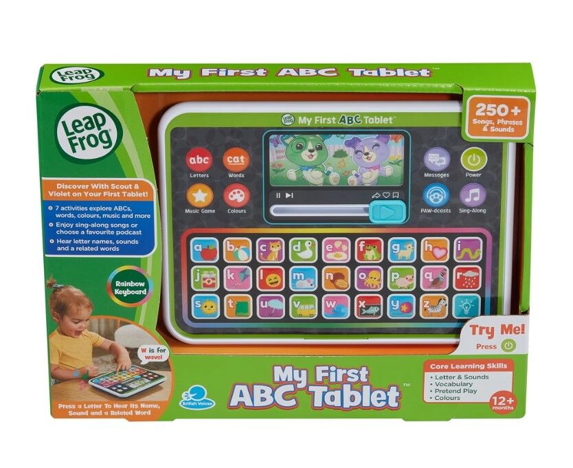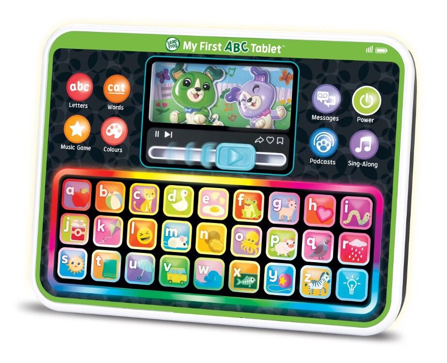 Discover endless learning fun with the My First ABC Tablet! With 26 interactive letter keys, little learners can explore the alphabet, colours, and animals while building early recognition skills. Four exciting learning modes introduce letters and their sounds, numbers, animal names, sounds, and fun facts to make education engaging and playful. Press the three activity buttons to hear pretend messages from Scout and Violet, short and silly “paw-dcasts,” and cheerful songs. Move the slider to watch Scout and Violet come to life with interactive audio. Featuring a trendy backlit keyboard with two glowing patterns, this cool toy makes learning magical!
